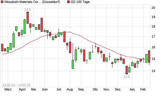 Mit dem Rücksetzer auf 14,50 EUR hat die Mitsubishi Materials-Aktie am 13.02.2025 die 100-Tage-Linie nach unten gekreuzt.