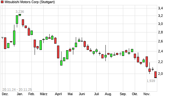 Mit dem Rücksetzer auf 1,99 EUR hat die Mitsubishi Motors-Aktie (ISIN JP3899800001) am 19.11.2025 ein neues 3-Jahres-Tief erreicht und damit den Kurs vom 18.11.2025 eingestellt.