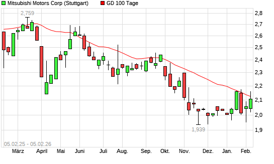 Mit dem Anstieg auf 2,12 EUR hat die Mitsubishi Motors-Aktie am 04.02.2026 die 100-Tage-Linie nach oben gekreuzt.