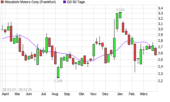 Mit dem Rücksetzer auf 2,65 EUR hat die Mitsubishi Motors-Aktie am 27.03.2025 die 50-Tage-Linie nach unten gekreuzt.