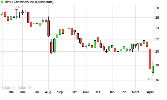 Mit dem Rücksetzer auf 16,90 EUR hat die Mitsui Chemicals-Aktie (ISIN JP3888300005) am 07.04.2025 ein neues 3-Jahres-Tief erreicht und damit den Kurs vom 21.10.2022 eingestellt.