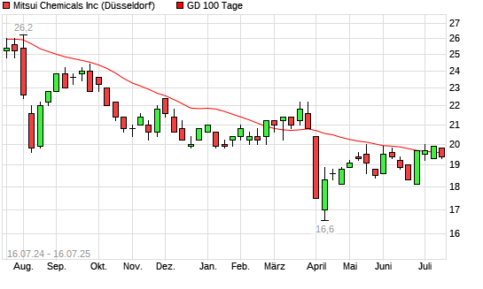 Mit dem Rücksetzer auf 19,70 EUR hat die Mitsui Chemicals-Aktie am 15.07.2025 die 100-Tage-Linie nach unten gekreuzt.