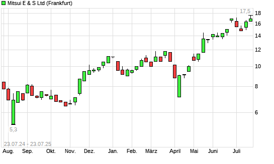Mit dem Anstieg auf 17,50 EUR hat die Mitsui E&S Holdings-Aktie (ISIN JP3891600003) am 22.07.2025 ein neues 10-Jahres-Hoch erreicht und damit den Kurs vom 01.07.2025 eingestellt.