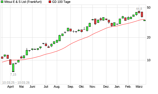 Mit dem Rücksetzer auf 33,40 EUR hat die Mitsui E&S Holdings-Aktie am 09.03.2026 die 100-Tage-Linie nach unten gekreuzt.Die Mitsui E&S Holdings-Aktie befindet sich seit ...weiterlesen