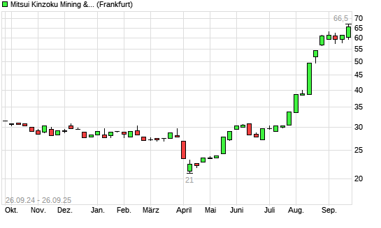 Mit dem Anstieg auf 66,50 EUR hat die Mitsui Mining & Smelting-Aktie (ISIN JP3888400003) am 25.09.2025 ein neues 10-Jahres-Hoch erreicht und damit den Kurs vom 03.09.2025 eingestellt.