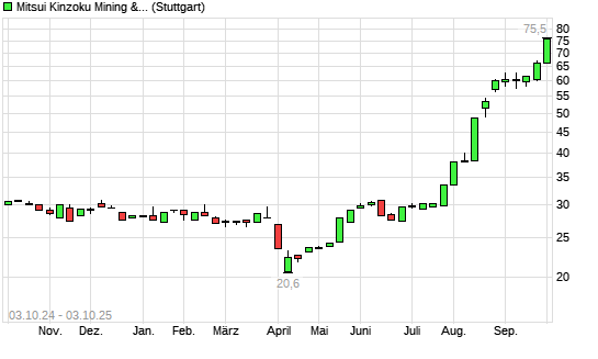 Mit dem Anstieg auf 71,50 EUR hat die Mitsui Mining & Smelting-Aktie (ISIN JP3888400003) am 02.10.2025 ein neues All-Time-High erreicht und damit den Kurs vom 06.02.2006 eingestellt.