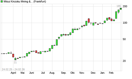 Mit dem Anstieg auf 176,00 EUR hat die Mitsui Mining & Smelting-Aktie (ISIN JP3888400003) am 23.02.2026 ein neues All-Time-High erreicht und damit den Kurs vom 20.02.2026 eingestellt.