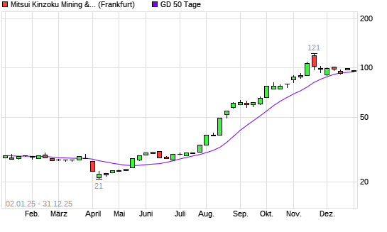 Mit dem Rücksetzer auf 95,50 EUR hat die Mitsui Mining & Smelting-Aktie am 30.12.2025 die 50-Tage-Linie nach unten gekreuzt.
