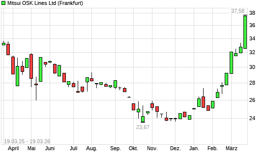 Mit dem Anstieg auf 37,48 EUR hat die Mitsui OSK Lines-Aktie (ISIN JP3362700001) am 18.03.2026 ein neues 10-Jahres-Hoch erreicht und damit den Kurs vom 20.02.2025 eingestellt.