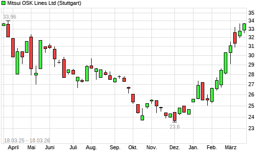 Mit dem Anstieg auf 33,62 EUR hat die Mitsui OSK Lines-Aktie (ISIN JP3362700001) am 17.03.2026 ein neues 12-Monats-Hoch erreicht und damit den Kurs vom 20.03.2025 eingestellt.
