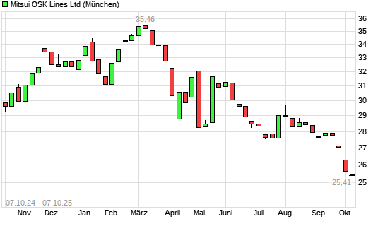 Mit dem Rücksetzer auf 24,72 EUR hat die Mitsui O.S.K. Lines-Aktie (ISIN JP3362700001) am 06.10.2025 ein neues 12-Monats-Tief erreicht und damit den Kurs vom 03.10.2025 eingestellt.