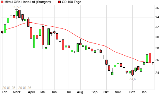 Mit dem Anstieg auf 25,41 EUR hat die Mitsui OSK Lines-Aktie am 19.01.2026 die 100-Tage-Linie nach oben gekreuzt.