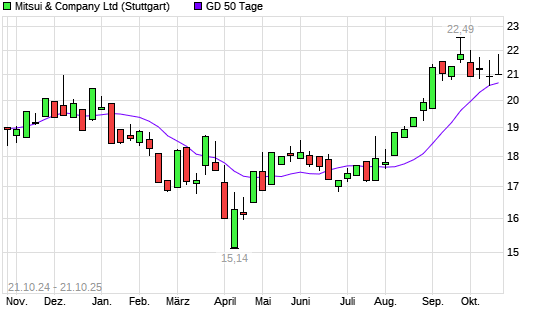 Mit dem Anstieg auf 21,41 EUR hat die Mitsui & Co-Aktie am 20.10.2025 die 50-Tage-Linie nach oben gekreuzt.Die Mitsui & Co-Aktie befindet sich seit dem 06.08.2025 im langfristigen Aufwärtstrend ...weiterlesen