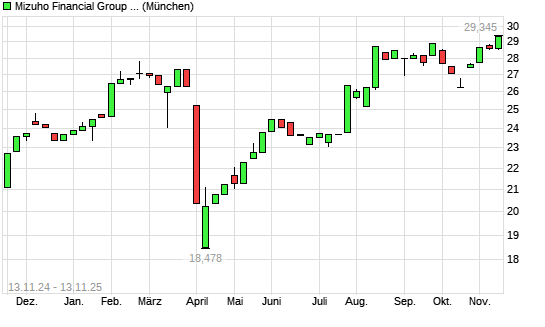 Mit dem Anstieg auf 28,83 EUR hat die Mizuho Financial Group-Aktie (ISIN JP3885780001) am 12.11.2025 ein neues 10-Jahres-Hoch erreicht und damit den Kurs vom 15.08.2025 eingestellt.