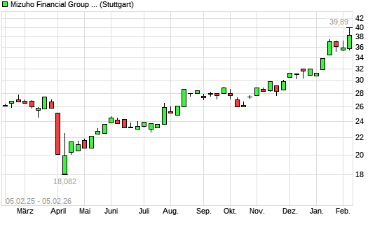 Mit dem Anstieg auf 39,20 EUR hat die Mizuho Financial Group-Aktie (ISIN JP3885780001) am 04.02.2026 ein neues 10-Jahres-Hoch erreicht und damit den Kurs vom 02.02.2026 eingestellt.