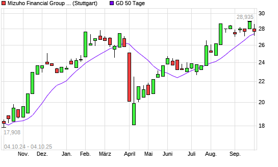Mit dem Anstieg auf 27,74 EUR hat die Mizuho Financial Group-Aktie am 03.10.2025 die 50-Tage-Linie nach oben gekreuzt.