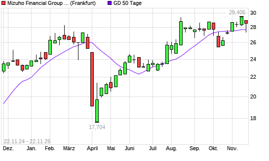 Mit dem Anstieg auf 28,51 EUR hat die Mizuho Financial Group-Aktie am 21.11.2025 die 50-Tage-Linie nach oben gekreuzt.