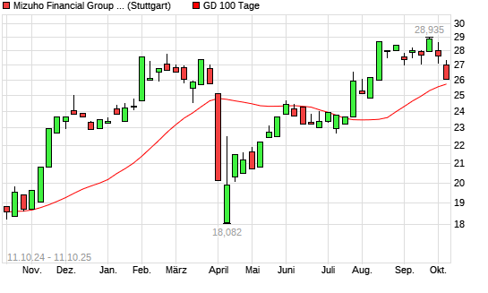 Mit dem Rücksetzer auf 25,43 EUR hat die Mizuho Financial Group-Aktie am 10.10.2025 die 100-Tage-Linie nach unten gekreuzt.