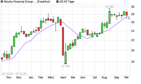 Mit dem Rücksetzer auf 27,16 EUR hat die Mizuho Financial Group-Aktie am 06.10.2025 die 50-Tage-Linie nach unten gekreuzt.