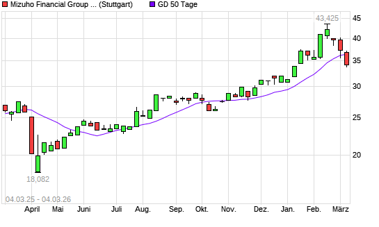 Mit dem Rücksetzer auf 34,27 EUR hat die Mizuho Financial Group-Aktie am 03.03.2026 die 50-Tage-Linie nach unten gekreuzt.Die Mizuho Financial Group-Aktie befindet sich seit ...weiterlesen