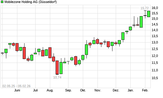 Mit dem Anstieg auf 15,56 EUR hat die Mobilzone-Aktie (ISIN CH0276837694) am 04.02.2026 ein neues 12-Monats-Hoch erreicht und damit den Kurs vom 27.01.2026 eingestellt.