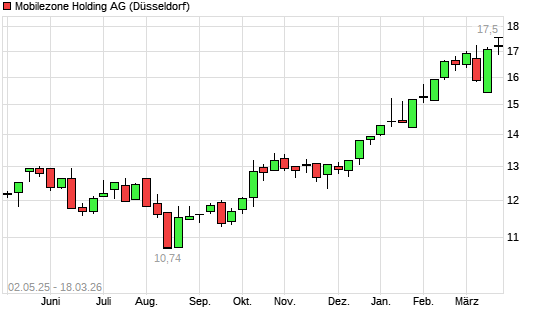 Mit dem Anstieg auf 17,16 EUR hat die Mobilzone-Aktie (ISIN CH0276837694) am 17.03.2026 ein neues 3-Jahres-Hoch erreicht und damit den Kurs vom 04.03.2026 eingestellt.