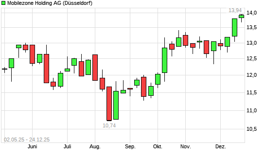 Mit dem Anstieg auf 13,78 EUR hat die Mobilzone-Aktie (ISIN CH0276837694) am 23.12.2025 ein neues 6-Monats-Hoch erreicht und damit den Kurs vom 22.12.2025 eingestellt.