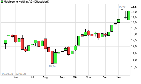Mit dem Anstieg auf 15,04 EUR hat die Mobilzone-Aktie (ISIN CH0276837694) am 22.01.2026 ein neues 12-Monats-Hoch erreicht und damit den Kurs vom 07.01.2026 eingestellt.Der Abstand zur 200-Tage-Linie ...weiterlesen