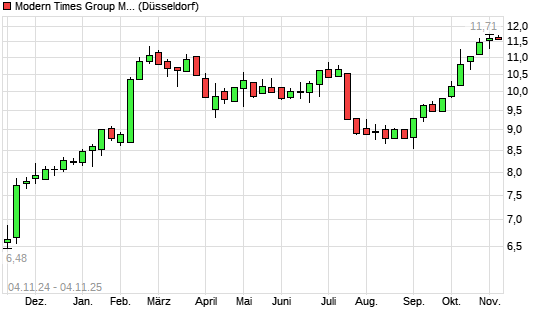 Mit dem Anstieg auf 11,67 EUR hat die Modern Times Group B-Aktie (ISIN SE0018012494) am 03.11.2025 ein neues 10-Jahres-Hoch erreicht und damit den Kurs vom 31.10.2025 eingestellt.