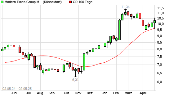 Mit dem Anstieg auf 10,56 EUR hat die Modern Times Group B-Aktie am 02.05.2025 die 100-Tage-Linie nach oben gekreuzt.