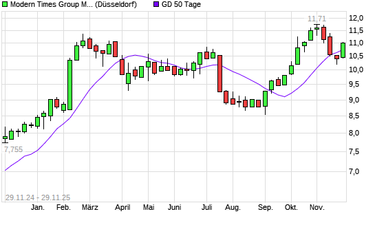 Mit dem Anstieg auf 10,95 EUR hat die Modern Times Group B-Aktie am 28.11.2025 die 50-Tage-Linie nach oben gekreuzt.