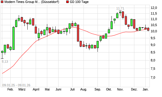 Mit dem Rücksetzer auf 10,11 EUR hat die Modern Times Group B-Aktie am 08.01.2026 die 100-Tage-Linie nach unten gekreuzt.