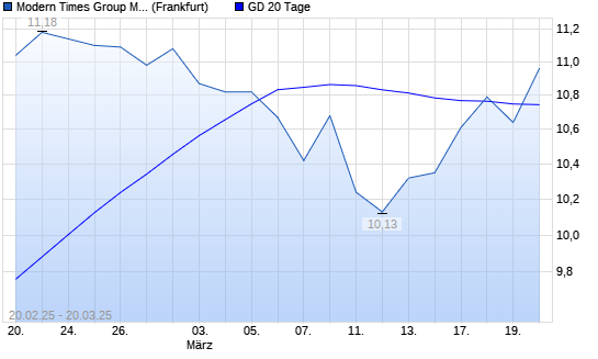 Mit dem Rücksetzer auf 10,64 EUR hat die Modern Times Group B-Aktie am 19.03.2025 die 20-Tage-Linie nach unten gekreuzt.