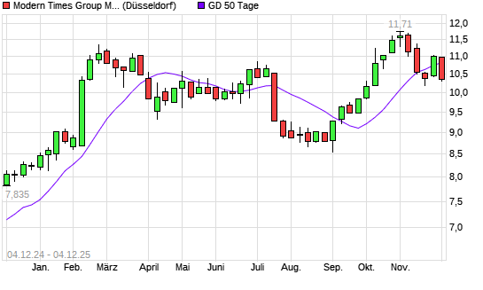 Mit dem Rücksetzer auf 10,54 EUR hat die Modern Times Group B-Aktie am 03.12.2025 die 50-Tage-Linie nach unten gekreuzt.