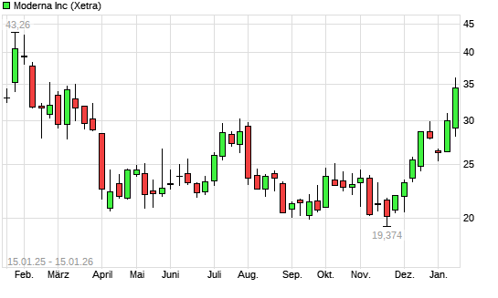 Mit dem Anstieg auf 34,91 EUR hat die Moderna-Aktie (ISIN US60770K1079) am 14.01.2026 ein neues 6-Monats-Hoch erreicht und damit den Kurs vom 13.01.2026 eingestellt.
