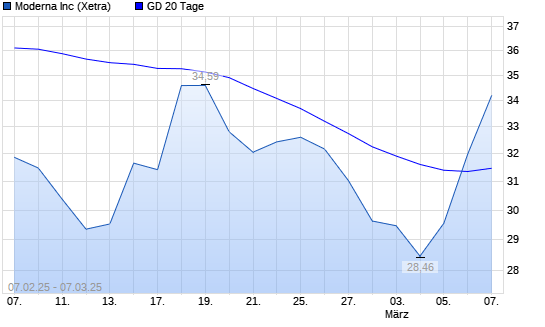 Mit dem Anstieg auf 32,59 EUR hat die Moderna-Aktie am 06.03.2025 die 20-Tage-Linie nach oben gekreuzt.