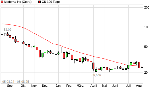 Mit dem Rücksetzer auf 24,05 EUR hat die Moderna-Aktie am 04.08.2025 die 100-Tage-Linie nach unten gekreuzt.