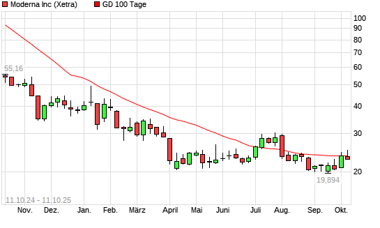 Mit dem Rücksetzer auf 22,77 EUR hat die Moderna-Aktie am 10.10.2025 die 100-Tage-Linie nach unten gekreuzt.