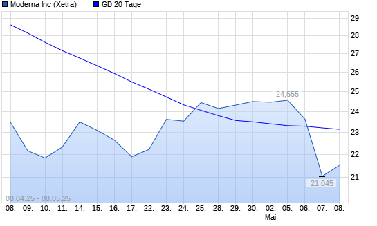 Mit dem Rücksetzer auf 21,99 EUR hat die Moderna-Aktie am 07.05.2025 die 20-Tage-Linie nach unten gekreuzt.