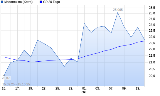 Mit dem Rücksetzer auf 22,54 EUR hat die Moderna-Aktie am 14.10.2025 die 20-Tage-Linie nach unten gekreuzt.