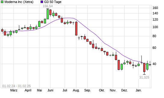 Mit dem Rücksetzer auf 38,51 EUR hat die Moderna-Aktie am 31.01.2025 die 50-Tage-Linie nach unten gekreuzt.