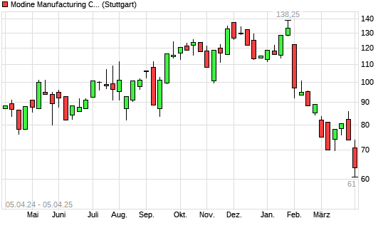 Mit dem Rücksetzer auf 65,04 EUR hat die Modine Manufacturing-Aktie (ISIN US6078281002) am 04.04.2025 ein neues 12-Monats-Tief erreicht und damit den Kurs vom 07.03.2025 eingestellt.
