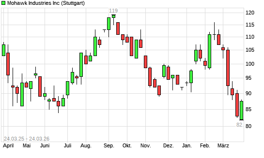 Mit dem Rücksetzer auf 82,00 EUR hat die Mohawk Industries-Aktie (ISIN US6081901042) am 23.03.2026 ein neues 12-Monats-Tief erreicht und damit den Kurs vom 20.03.2026 eingestellt.
