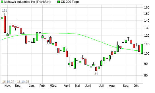 Mit dem Anstieg auf 110,00 EUR hat die Mohawk Industries-Aktie am 15.10.2025 die 200-Tage-Linie nach oben gekreuzt.