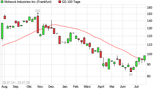 Mit dem Rücksetzer auf 92,50 EUR hat die Mohawk Industries-Aktie am 22.07.2025 die 100-Tage-Linie nach unten gekreuzt.
