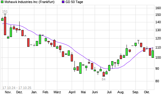 Mit dem Rücksetzer auf 108,00 EUR hat die Mohawk Industries-Aktie am 16.10.2025 die 50-Tage-Linie nach unten gekreuzt.