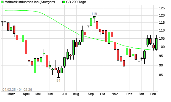 Mit dem Anstieg auf 101,00 EUR hat die Mohawk Industries-Aktie am 03.02.2026 die 200-Tage-Linie nach oben gekreuzt.Die Mohawk Industries-Aktie befand sich seit dem 02.02.2026 im langfristigen ...weiterlesen
