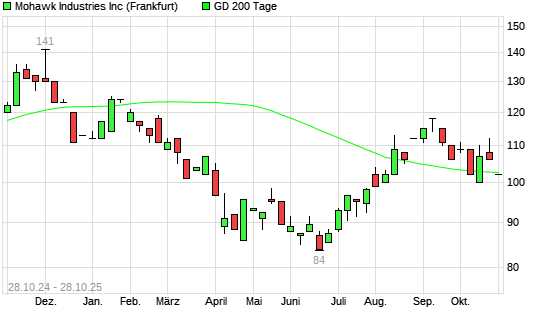 Mit dem Rücksetzer auf 102,00 EUR hat die Mohawk Industries-Aktie am 27.10.2025 die 200-Tage-Linie nach unten gekreuzt.Die Mohawk Industries-Aktie befand sich seit dem 15.10.2025 im langfristigen ...weiterlesen