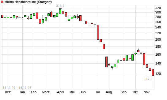 Mit dem Rücksetzer auf 121,10 EUR hat die Molina Healthcare-Aktie (ISIN US60855R1005) am 13.11.2025 ein neues 5-Jahres-Tief erreicht und damit den Kurs vom 11.11.2025 eingestellt.