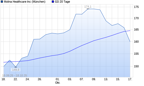 Mit dem Rücksetzer auf 159,00 EUR hat die Molina Healthcare-Aktie am 17.10.2025 die 20-Tage-Linie nach unten gekreuzt.